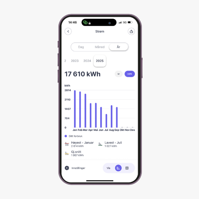Logg deg inn i Vibb-appen. Velg forbruk og strøm. Her finner du forbruket ditt per dag, måned og år. Velg år og 2024 for å se totalforbruket ditt på ett år. Dette tallet kan du legge inn i kalkulatoren for å få best mulig estimat på hva som lønner seg for deg.
